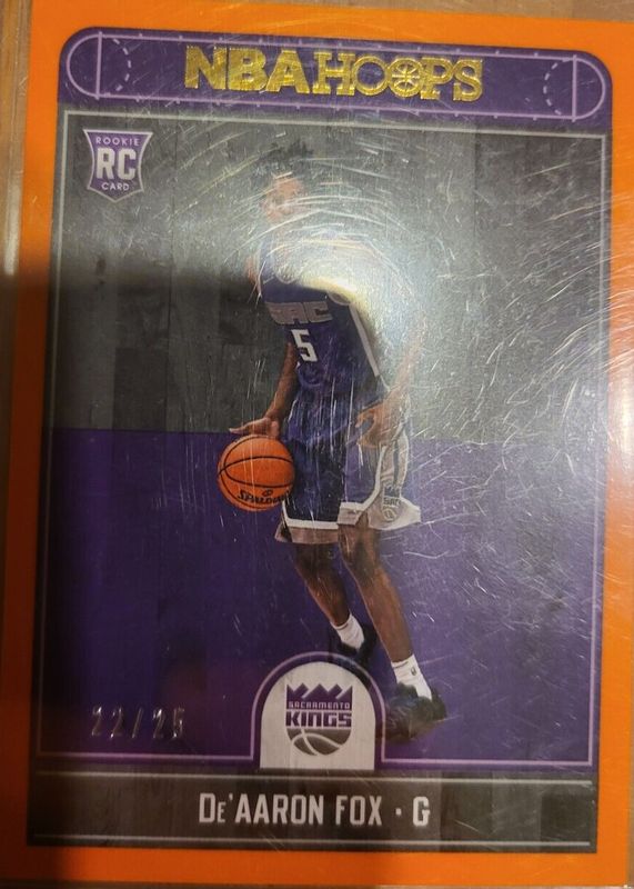 The De'Aaron Fox 2017 Hoops #255 Orange /25 Rookie card in Raw condition has not changed in price in the last 30 days and was last sold for $30.00 .