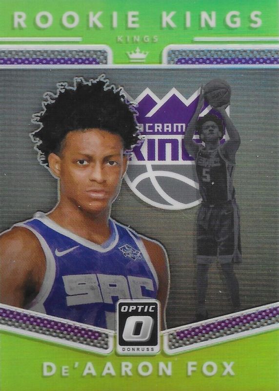 The De'Aaron Fox 2017 Optic #5 Rookie Kings - Lime /149 card in Raw condition has not changed in price in the last 30 days and was last sold for $19.99 .