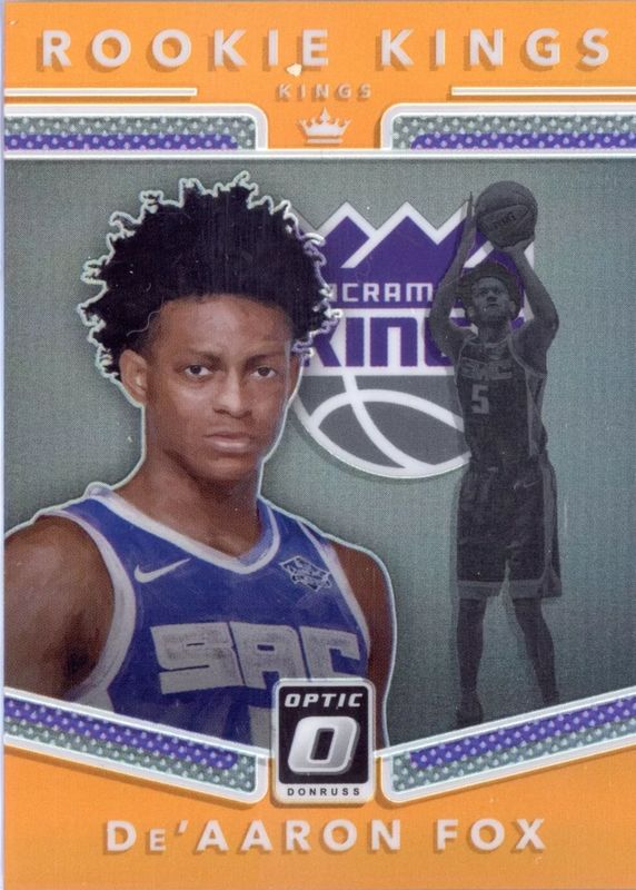 The De'Aaron Fox 2017 Optic #5 Rookie Kings - Orange /9 card in Raw condition has not changed in price in the last 30 days and was last sold for $172.19 .