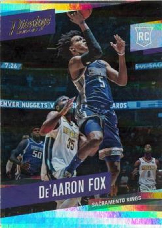The De'Aaron Fox 2017 Prestige #155 Horizon Rookie card is 1 of 27 De'Aaron Fox's card variations in the 2017 Prestige set being tracked by Sports Card Investor, including Base, Bonus Shots Signatures, Bonus Shots Signatures - Crystal, Micro Etch Rookies Bright - Green, and Micro Etch Rookies - Orange.
