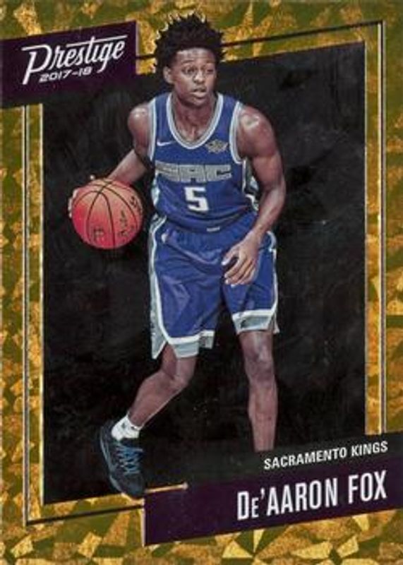 The De'Aaron Fox 2017 Prestige #5 Micro Etch Rookies - Orange card is 1 of 27 De'Aaron Fox's card variations in the 2017 Prestige set being tracked by Sports Card Investor, including Base, Bonus Shots Signatures, Bonus Shots Signatures - Crystal, Micro Etch Rookies Bright - Green, and Micro Etch Rookies - Red.