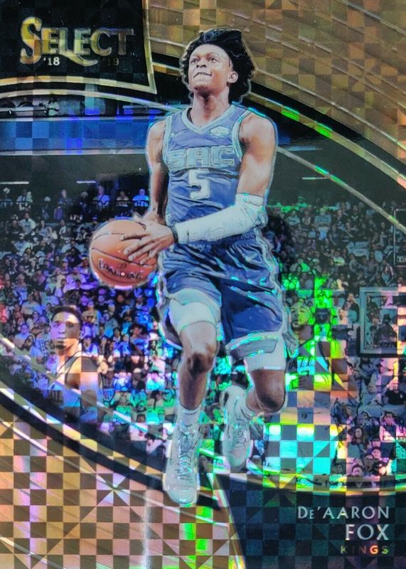 This card is 1 of 8 De'Aaron Fox's card variations in the 2018 Select set being tracked by Sports Card Investor, including Courtside Silver, Courtside Zebra /(SSP), Courtside Tie-Dye /25, Courtside FOTL Neon Orange Pulsar /13, and Courtside Gold /10.