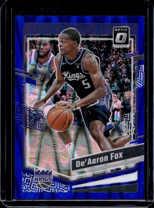 The De'Aaron Fox 2023 Optic #52 Blue Seismic /249 card is 1 of 96 De'Aaron Fox's card variations in the 2023 Optic set being tracked by Sports Card Investor, including Base, Blue Velocity, Checkerboard, Choice Red & Green, and Fast Break.