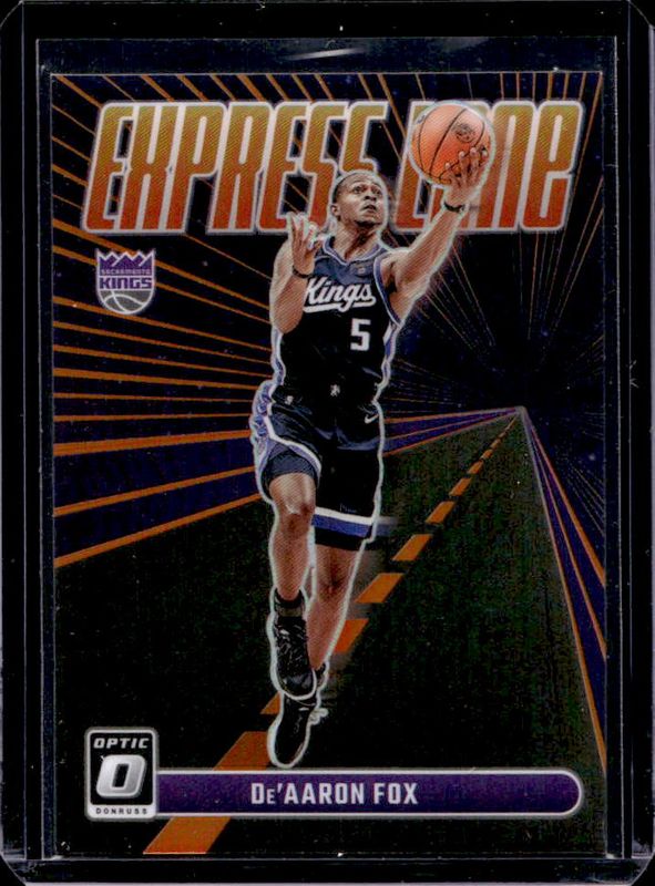 The De'Aaron Fox 2023 Optic #16 Express Lane - Orange /39 card is 1 of 96 De'Aaron Fox's card variations in the 2023 Optic set being tracked by Sports Card Investor, including Base, Blue Velocity, Checkerboard, Choice Red & Green, and Fast Break.