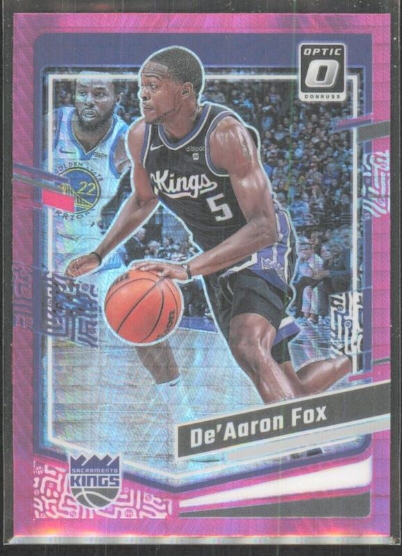 The De'Aaron Fox 2023 Optic #52 Hyper Pink card is 1 of 96 De'Aaron Fox's card variations in the 2023 Optic set being tracked by Sports Card Investor, including Base, Blue Velocity, Checkerboard, Choice Red & Green, and Fast Break.