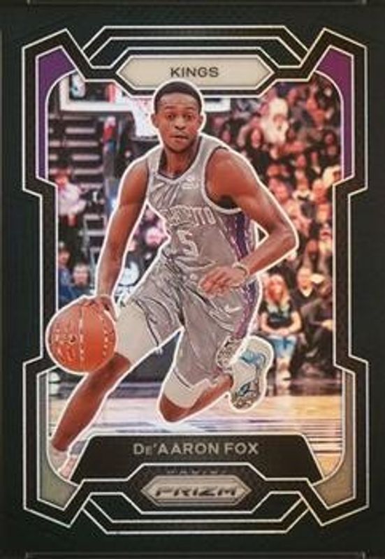 The De'Aaron Fox 2023 Prizm #6 Black /1 card is 1 of 86 De'Aaron Fox's card variations in the 2023 Prizm set being tracked by Sports Card Investor, including Base, Blue Wave, Choice Blue Yellow Green, Fast Break, and Green.