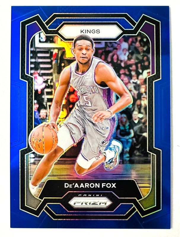 The De'Aaron Fox 2023 Prizm #6 Blue /199 card is 1 of 86 De'Aaron Fox's card variations in the 2023 Prizm set being tracked by Sports Card Investor, including Base, Blue Wave, Choice Blue Yellow Green, Fast Break, and Green.