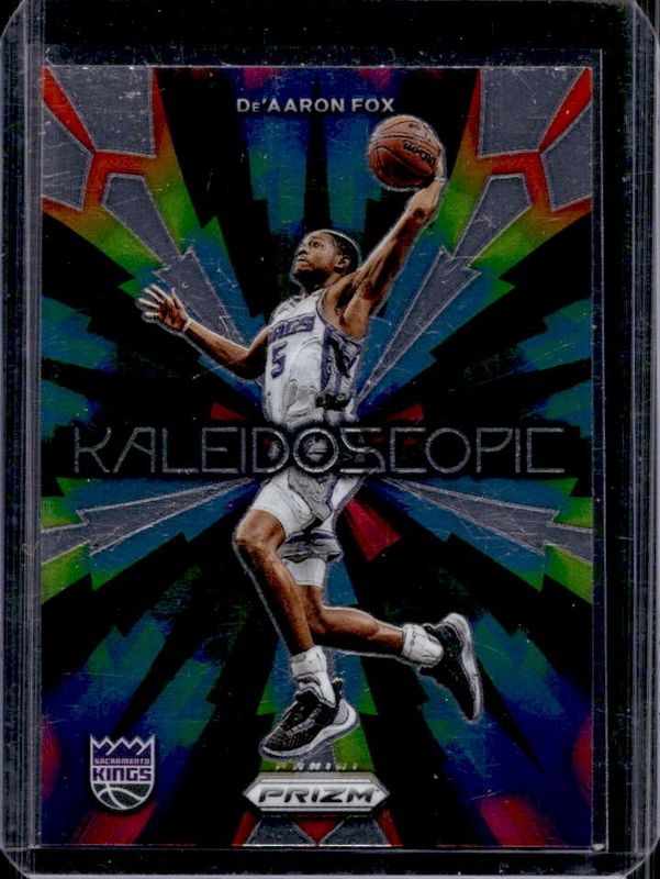 The De'Aaron Fox 2023 Prizm #29 Kaleidoscopic card is 1 of 86 De'Aaron Fox's card variations in the 2023 Prizm set being tracked by Sports Card Investor, including Base, Blue Wave, Choice Blue Yellow Green, Fast Break, and Green.