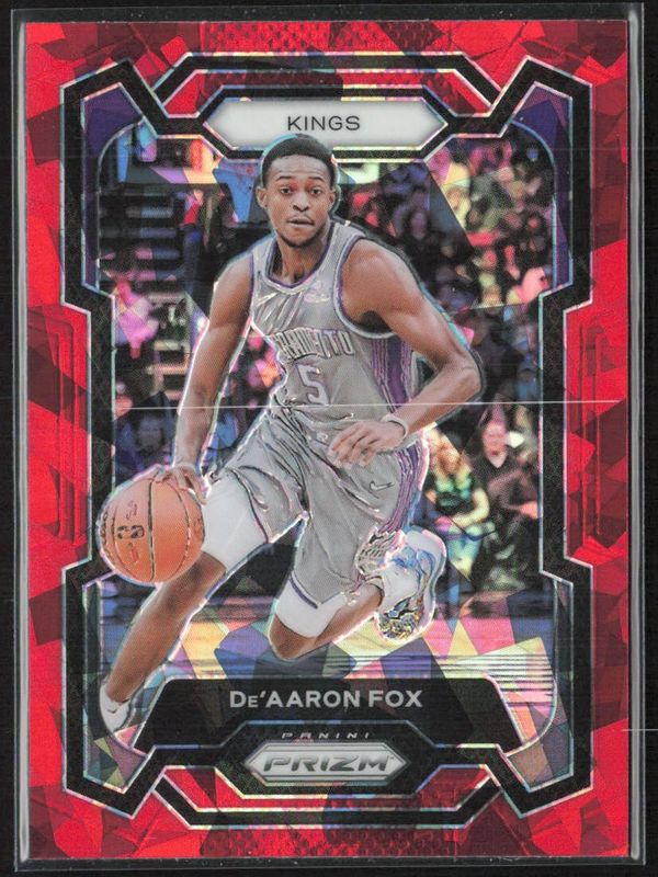 The De'Aaron Fox 2023 Prizm #6 Red Ice card is 1 of 86 De'Aaron Fox's card variations in the 2023 Prizm set being tracked by Sports Card Investor, including Base, Blue Wave, Choice Blue Yellow Green, Fast Break, and Green.