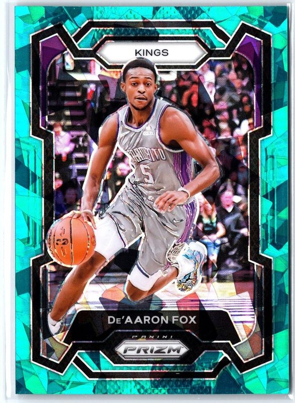 The De'Aaron Fox 2023 Prizm #6 Teal Ice /225 card is 1 of 86 De'Aaron Fox's card variations in the 2023 Prizm set being tracked by Sports Card Investor, including Base, Blue Wave, Choice Blue Yellow Green, Fast Break, and Green.