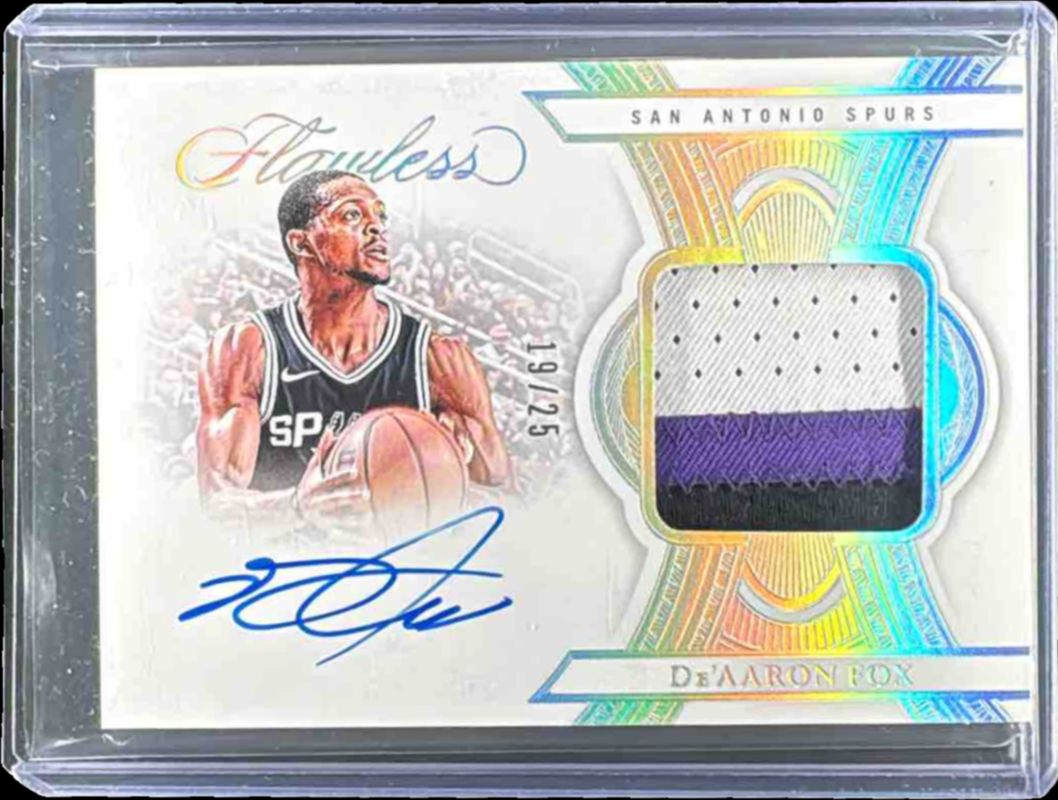The De'Aaron Fox 2024 Flawless #9 Flawless Patch Autographs /25 card is 1 of 44 De'Aaron Fox's card variations in the 2024 Flawless set being tracked by Sports Card Investor, including Base /20, Gold /10, Emerald /5, Fuchsia /3, and Platinum /1.