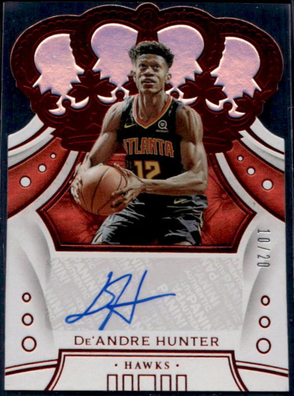 The De'Andre Hunter 2019 Crown Royale #CR-DAH Crown Autographs Rookies - Red /49 card is 1 of 38 De'Andre Hunter's card variations in the 2019 Crown Royale set being tracked by Sports Card Investor, including #116 Base, #49 Base, #49 Crystal, #49 Crystal Blue /99, and #49 Crystal Red /49.
