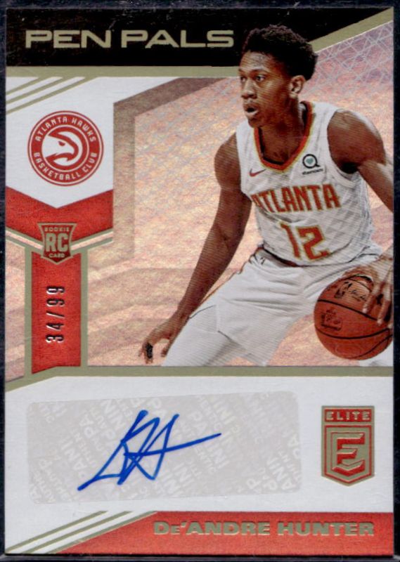 The De'Andre Hunter 2019 Elite #PP-DAH Pen Pals /99 Rookie card is 1 of 15 De'Andre Hunter's card variations in the 2019 Elite set being tracked by Sports Card Investor, including Base /299, Base Rookie /299, Aspirations (/88), Red, and Status (/12).