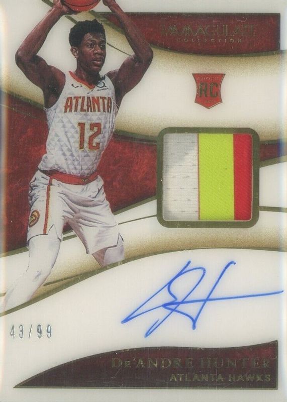 This card is 1 of 6 De'Andre Hunter's card variations in the 2019 Immaculate set being tracked by Sports Card Investor, including Rookie Patch Auto - Jersey Number (/12), Rookie Patch Auto - Red /25, Rookie Patch Auto - Gold /10, Rookie Patch Auto - Tag /5, and Rookie Patch Auto - Logoman /1.