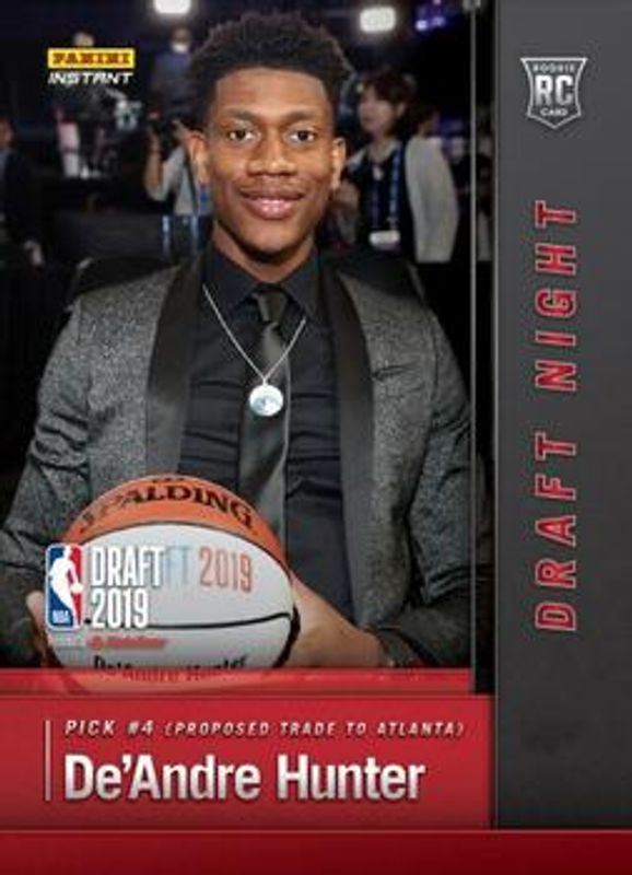 The De'Andre Hunter 2019 Panini Instant Draft Night #DN-DH Base Rookie card is 1 of 4 De'Andre Hunter's card variations in the 2019 Panini Instant Draft Night set being tracked by Sports Card Investor, including Black /25, Green /10, and One of One /1.