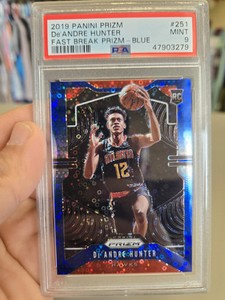 The De'Andre Hunter 2019 Prizm #251 Fast Break Blue /175 Rookie card in Raw condition has not changed in price in the last 30 days and was last sold for $7.00 .