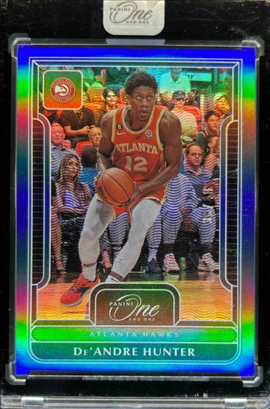 The De'Andre Hunter 2022 One and One #86 Base /99 card is 1 of 8 De'Andre Hunter's card variations in the 2022 One and One set being tracked by Sports Card Investor, including Blue /40, Purple /25, Red /15, Gold /10, and FOTL Pink /6.