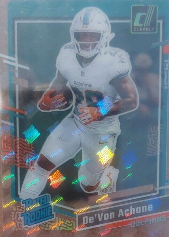 This card is 1 of 17 De'Von Achane's card variations in the 2023 Clearly Donruss set being tracked by Sports Card Investor, including Base, Gold, Holo Rated Rookie Logo, Purple /199, and Blue /99.