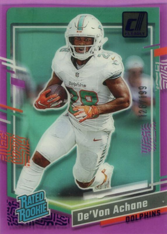 The De'Von Achane 2023 Clearly Donruss #59 Purple /199 Rookie card in Raw condition has not changed in price in the last 30 days and was last sold for $6.00 .