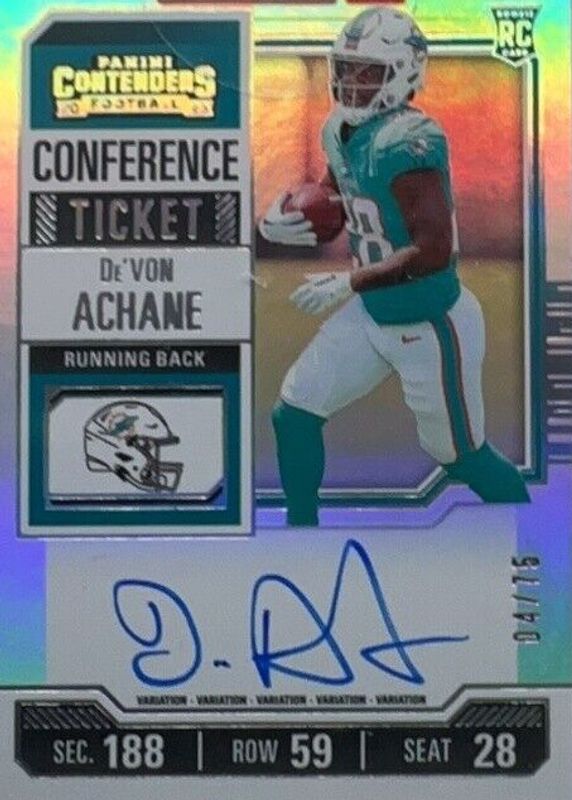 The De'Von Achane 2023 Contenders #109 Rookie Ticket Auto Variation - Conference Ticket /75 card in Raw condition has not changed in price in the last 30 days and was last sold for $55.00 .