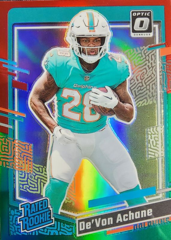 The De'Von Achane 2023 Donruss #365 Optic Preview - Red & Green Rookie card in Raw condition has moved up $0.25 (+12.5%) in the last 30 days and was last sold for $2.25 .