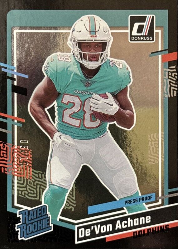 The De'Von Achane 2023 Donruss #365 Press Proof Black /10 Rookie card in Raw condition has not changed in price in the last 30 days and was last sold for $40.00 .