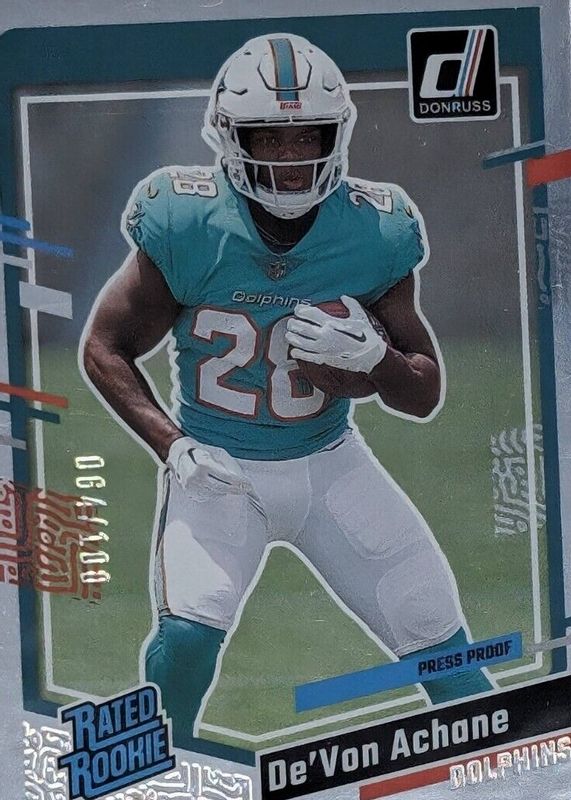 The De'Von Achane 2023 Donruss #365 Press Proof Silver /100 Rookie card in Raw condition has not changed in price in the last 30 days and was last sold for $5.00 .