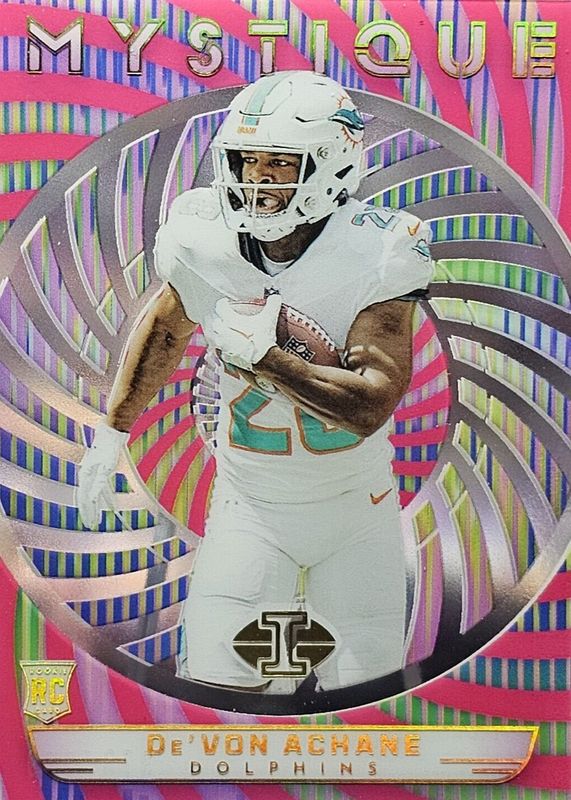 The De'Von Achane 2023 Illusions #9 Mystique - Pink /399 Rookie card in Raw condition has moved up $9.00 (+909%) in the last 30 days and was last sold for $9.99 .
