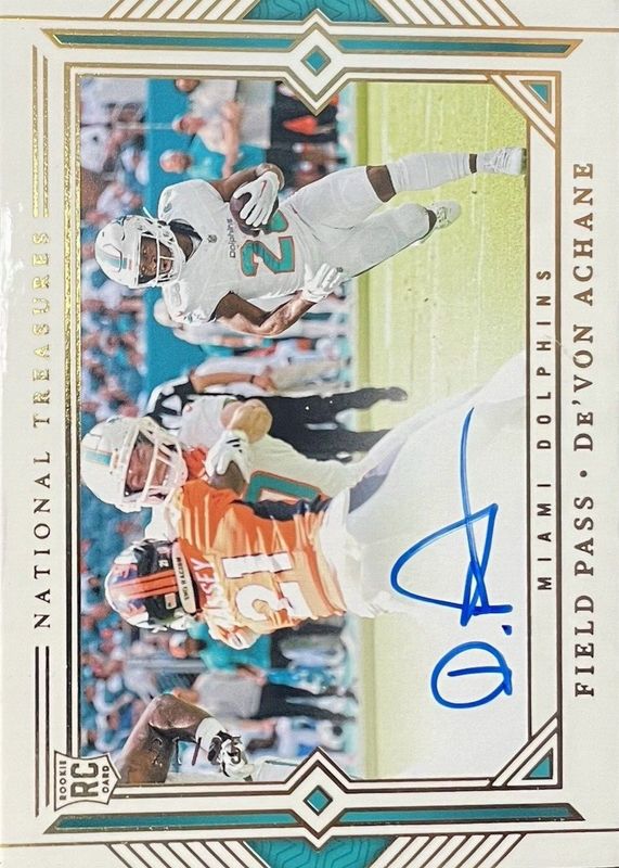 The De'Von Achane 2023 National Treasures #FP-DA Rookie Signatures Field Pass - Gold /25 card in Raw condition has not changed in price in the last 30 days and was last sold for $56.07 .