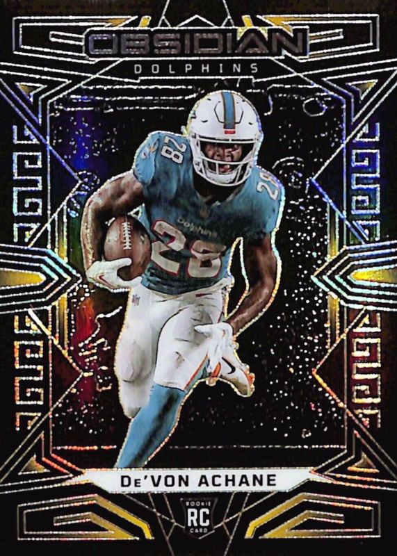 The De'Von Achane 2023 Obsidian #163 Electric Etch Yellow /10 Rookie card in Raw condition has not changed in price in the last 30 days and was last sold for $81.00 .