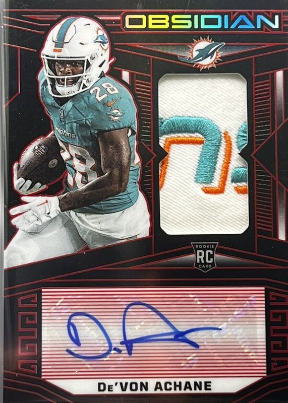 The De'Von Achane 2023 Obsidian #211 Rookie Jersey Autographs - Electric Etch Red /8 card in Raw condition has not changed in price in the last 30 days and was last sold for $184.99 .