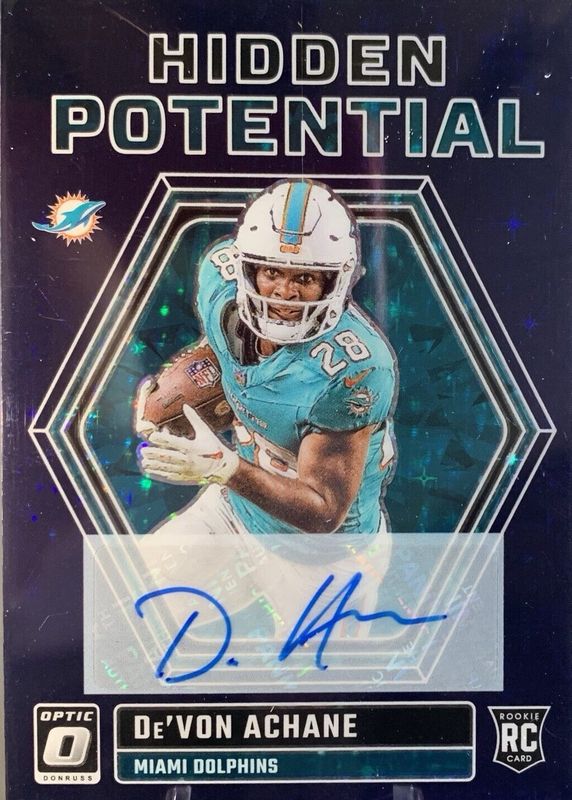 The De'Von Achane 2023 Optic #HP-DA Hidden Potential - Purple Stars /25 Rookie card in Raw condition has not changed in price in the last 30 days and was last sold for $25.00 .