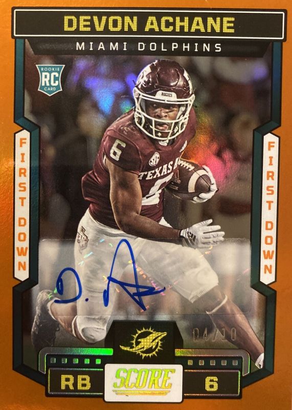 The De'Von Achane 2023 Score #317 Rookie Signatures - First Down /10 card in Raw condition has not changed in price in the last 30 days and was last sold for $110.00 .