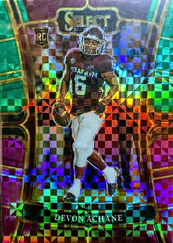 The De'Von Achane 2023 Select Draft Picks #20 Concourse Green & Purple Squares /100 Rookie card in Raw condition has not changed in price in the last 30 days and was last sold for $14.99 .