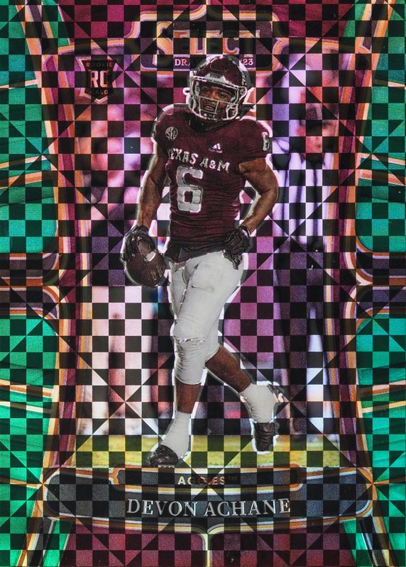 The De'Von Achane 2023 Select Draft Picks #20 Concourse Green Squares Rookie card in Raw condition has not changed in price in the last 30 days and was last sold for $7.49 .