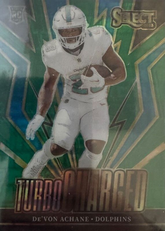 The De'Von Achane 2023 Select #TUR-DAC Turbocharged - Green /5 Rookie card in Raw condition has not changed in price in the last 30 days and was last sold for $49.99 .