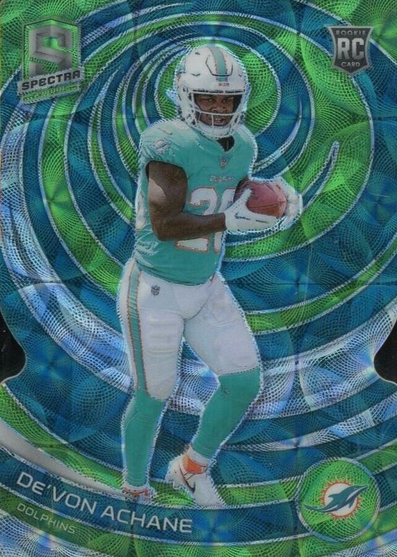 The De'Von Achane 2023 Spectra #160 Neon Green Die-Cut /30 Rookie card in Raw condition has not changed in price in the last 30 days and was last sold for $11.50 .