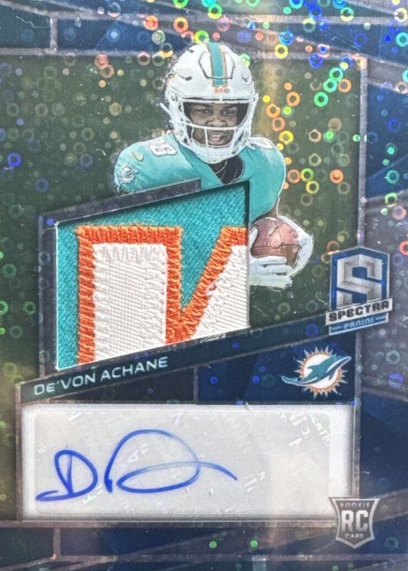 The De'Von Achane 2023 Spectra #209 Rookie Patch Auto - Neon Blue /50 card in Raw condition has not changed in price in the last 30 days and was last sold for $51.00 .
