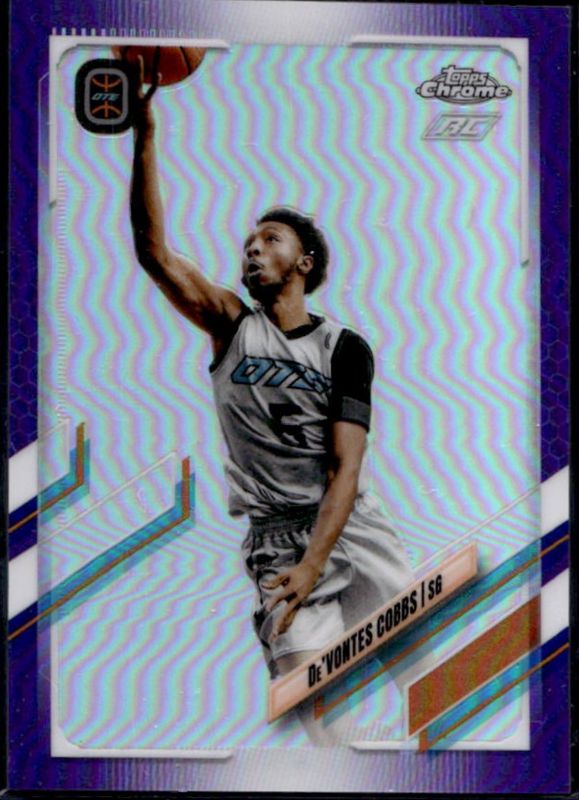 The De'Vontes Cobbs 2021 Topps Chrome OTE Overtime Elite #62 Purple /299 card is 1 of 147 De'Vontes Cobbs' card variations in the 2021 Topps Chrome OTE Overtime Elite set being tracked by Sports Card Investor, including #62 Base, #17 Base, #26 Base, #3 Base, and #3 OTE Refractor.
