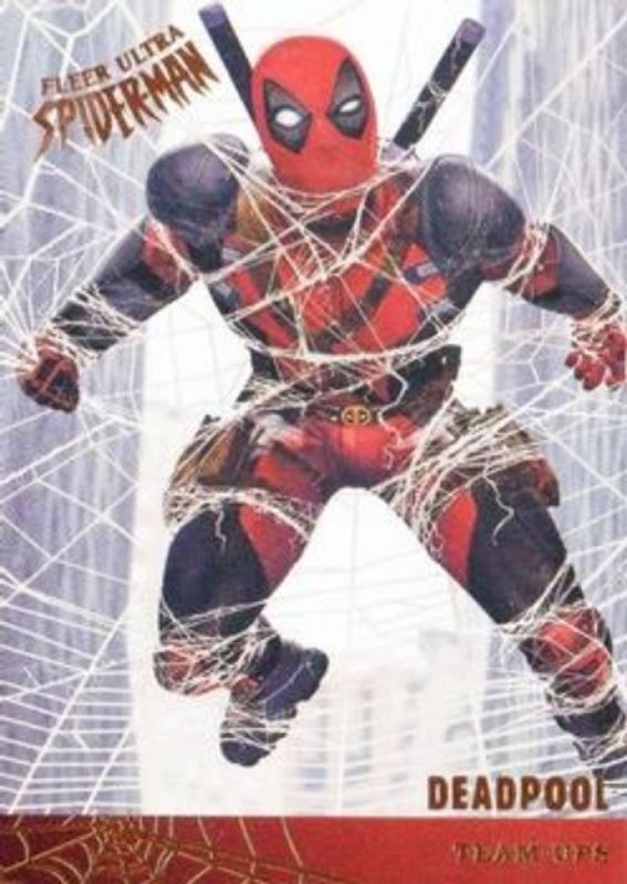 The Deadpool 2017 Fleer Ultra Spider-Man #TU11 Team Ups card is 1 of 38 Deadpool's card variations in the 2017 Fleer Ultra Spider-Man set being tracked by Sports Card Investor, including Base, Silver Web Foil, Gold Web Foil Autographs /49, Printing Plate Black /1, and Printing Plate Cyan /1.