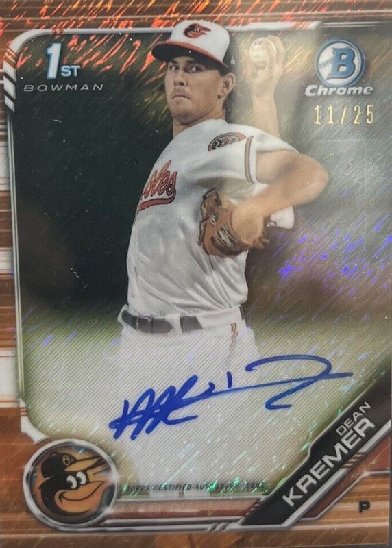 The Dean Kremer 2019 Bowman #CPA-DK Chrome Prospect Auto - Orange Refractor /25 (1st) card in Raw condition has not changed in price in the last 30 days and was last sold for $27.26 .