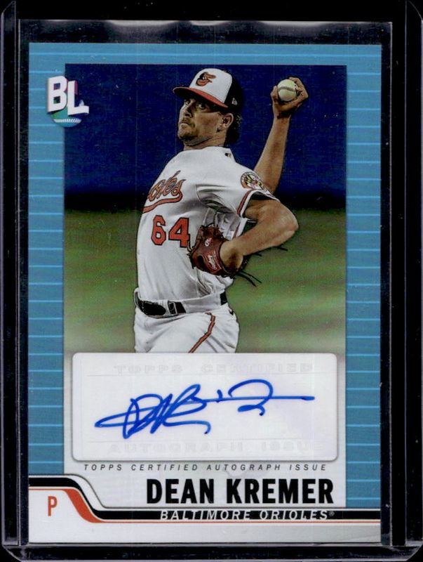 The Dean Kremer 2023 Topps Big League #BLA-KRE Big League Autographs - Blue Foil card is 1 of 6 Dean Kremer's card variations in the 2023 Topps Big League set being tracked by Sports Card Investor, including Big League Autographs - Green Foil /99, Big League Autographs - Gold Foil /50, Big League Autographs - Orange Foil /25, Big League Autographs - Red Foil /5, and Big League Autographs - Foilfractor /1.