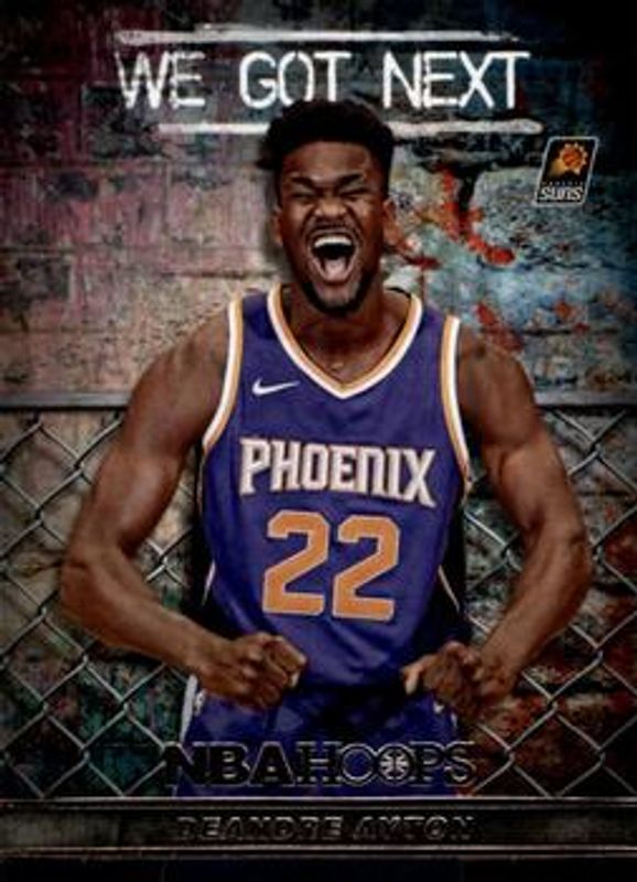 The Deandre Ayton 2018 Hoops #WGN-1 We Got Next Rookie card is 1 of 33 Deandre Ayton's card variations in the 2018 Hoops set being tracked by Sports Card Investor, including Base, Red Backs, Premium Box Set /199, Blue, and Class of 2018.