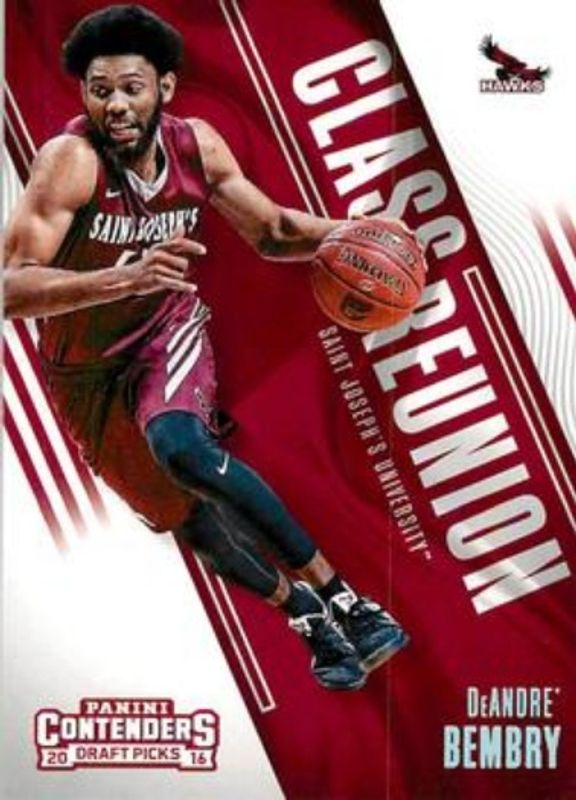 The DeAndre' Bembry 2016 Contenders Draft Picks #18 Class Reunion Rookie card is 1 of 25 DeAndre' Bembry's card variations in the 2016 Contenders Draft Picks set being tracked by Sports Card Investor, including College Ticket Auto, College Ticket Autographs - Draft Ticket Blue Foil, College Ticket Autographs - Draft Ticket Red Foil, College Ticket Autographs Variations, and College Ticket Autographs Variations Draft - Blue Foil.