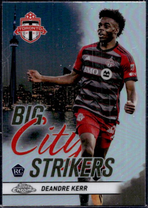 The Deandre Kerr 2024 Topps Chrome MLS #CS-7 Big City Strikers card is 1 of 74 Deandre Kerr's card variations in the 2024 Topps Chrome MLS set being tracked by Sports Card Investor, including #23 Base, #56 Base, #23 Aqua Lava Refractor, #56 Aqua Lava Refractor, and #56 Gold Lava Refractor.