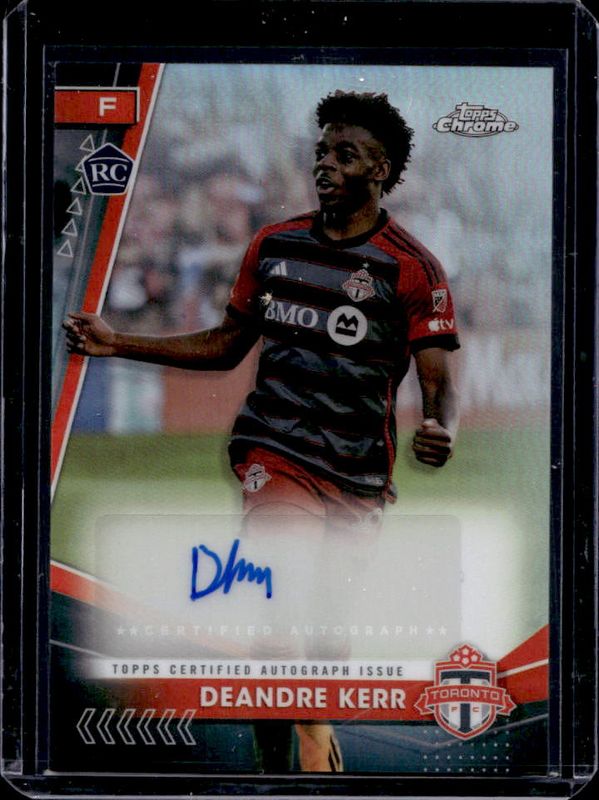 The Deandre Kerr 2024 Topps Chrome MLS #CA-DK Chrome Autographs card is 1 of 74 Deandre Kerr's card variations in the 2024 Topps Chrome MLS set being tracked by Sports Card Investor, including #23 Base, #56 Base, #23 Aqua Lava Refractor, #56 Aqua Lava Refractor, and #56 Gold Lava Refractor.