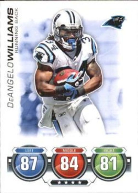 The DeAngelo Williams 2010 Topps Attax Base card is 1 of 2 DeAngelo Williams' card variations in the 2010 Topps Attax set being tracked by Sports Card Investor, including Red Zone Foil.