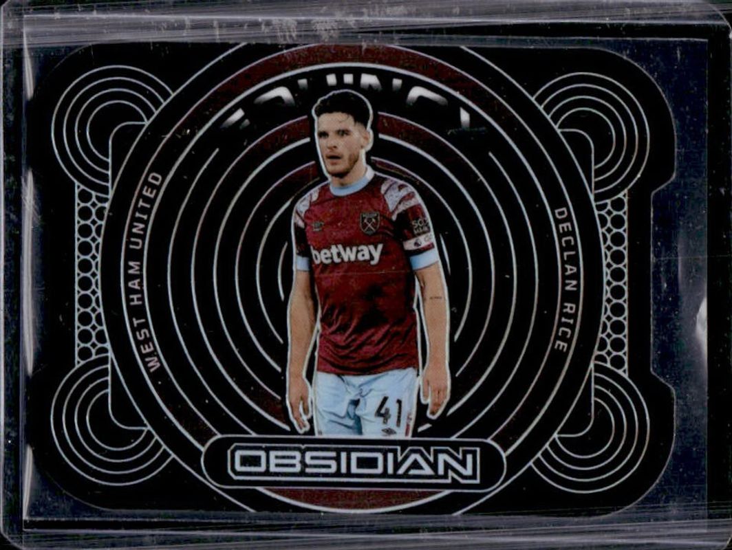 The Declan Rice 2022 Obsidian #25 Equinox /115 card is 1 of 24 Declan Rice's card variations in the 2022 Obsidian set being tracked by Sports Card Investor, including Base /115, Electric Etch Orange /40, Electric Etch Red Pulsar /30, Electric Etch Purple Flood /25, and Electric Etch Blue /20.