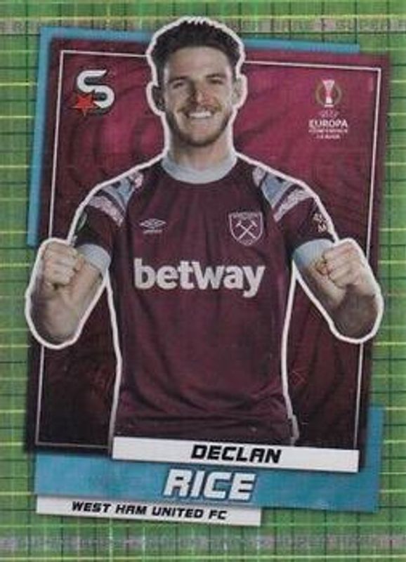 The Declan Rice 2022 Topps UEFA Superstars #184 Super Rare Mint /199 card is 1 of 22 Declan Rice's card variations in the 2022 Topps UEFA Superstars set being tracked by Sports Card Investor, including #184 Base, #184b Common Yellow, #184 Common Yellow, #184 Fire & Ice Limited, and #184 Molten Rare.