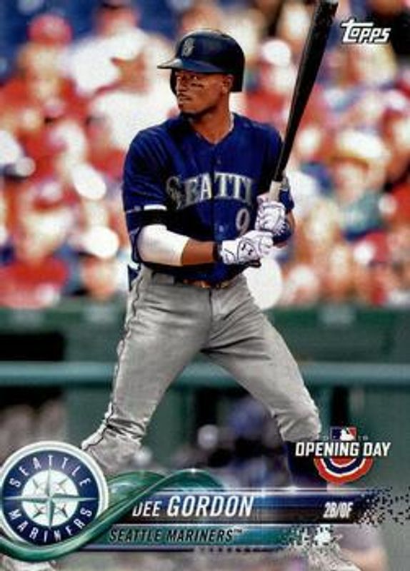 The Dee Gordon 2018 Topps Opening Day #170 Base card is 1 of 10 Dee Gordon's card variations in the 2018 Topps Opening Day set being tracked by Sports Card Investor, including Opening Day Edition Blue Foil, Purple, 5x7 /49, 5x7 Gold /10, and Opening Day 1 of 1 /1.